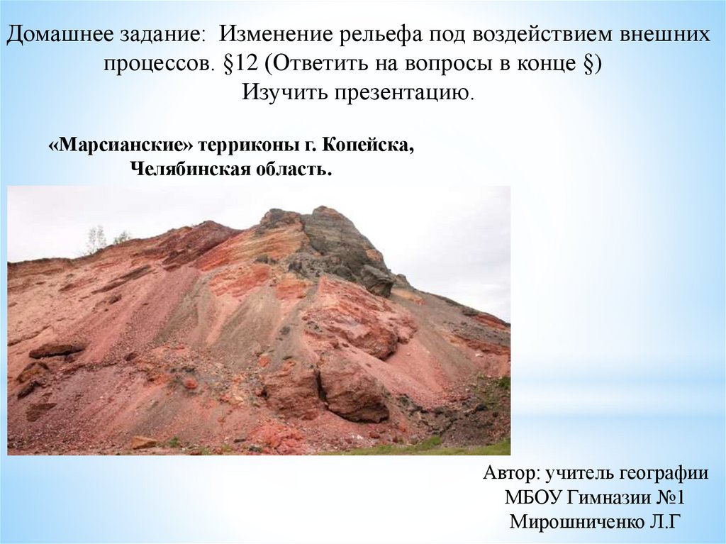 Домашнее задание: Изменение рельефа под воздействием внешнихпроцессов. §12 (Ответить на вопросы в конце §)