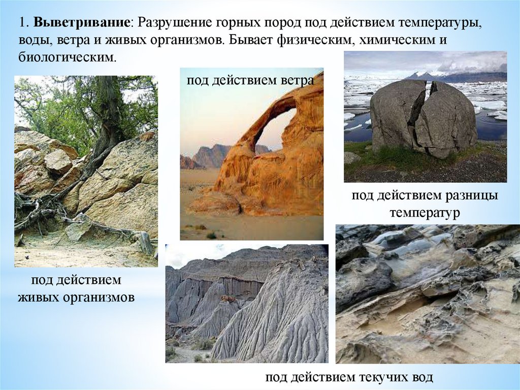 1. Выветривание: Разрушение горных пород под действием температуры,воды, ветра и живых организмов. Бывает физическим, химическим и