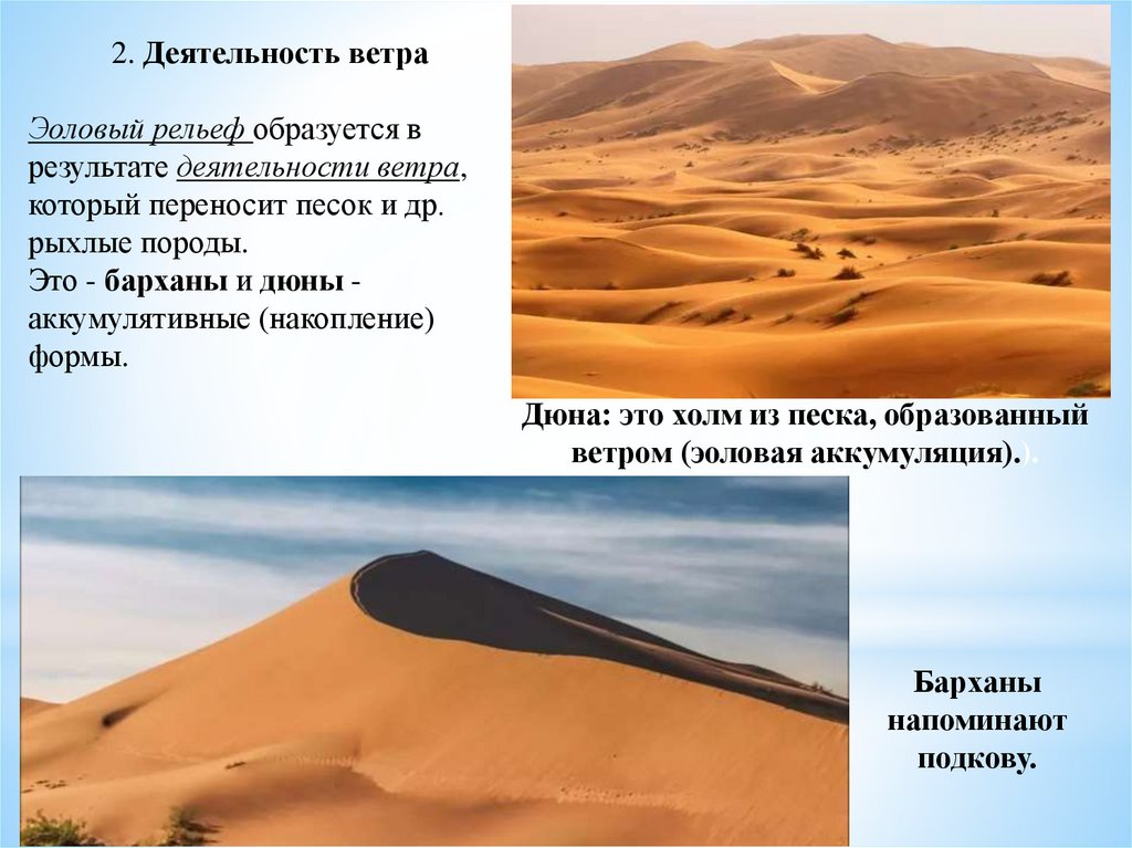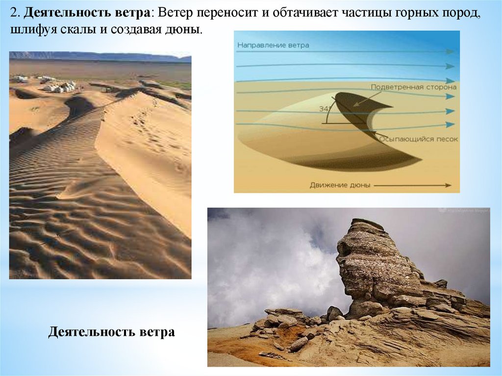 2. Деятельность ветра: Ветер переносит и обтачивает частицы горных пород,шлифуя скалы и создавая дюны.