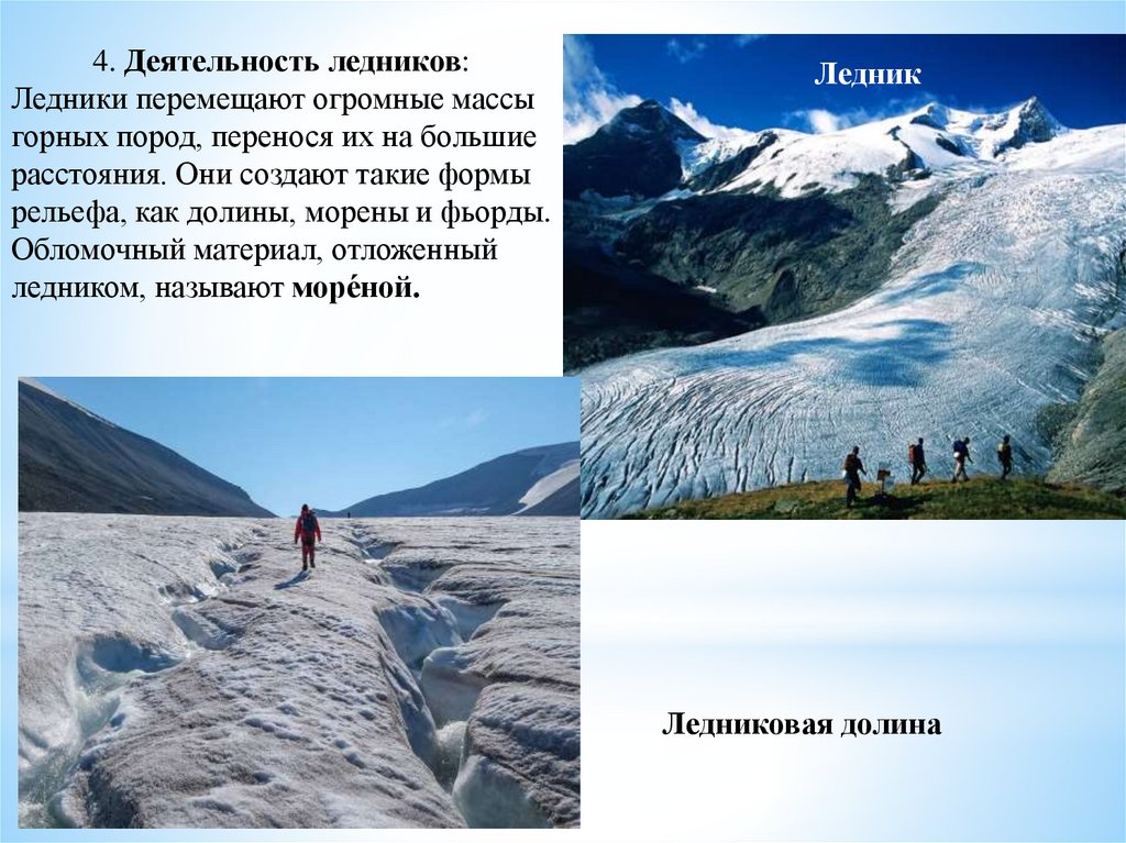 4. Деятельность ледников:Ледники перемещают огромные массы