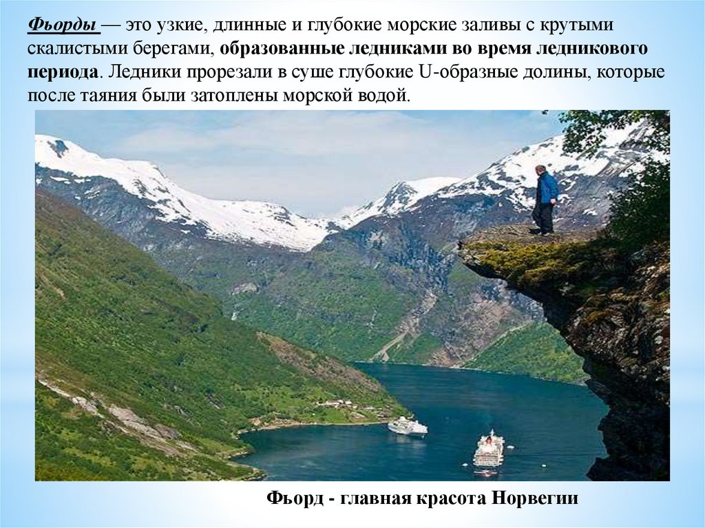 Фьорды — это узкие, длинные и глубокие морские заливы с крутымискалистыми берегами, образованные ледниками во время ледникового
