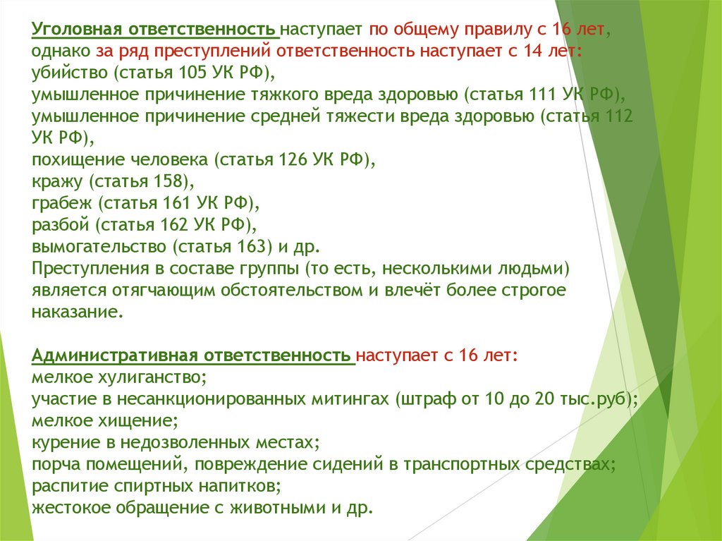 Уголовная ответственность наступает по общему правилу с 16 лет,однако за ряд преступлений ответственность наступает с 14 лет: