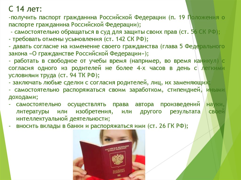 С 14 лет:-получить паспорт гражданина Российской Федерации (п. 19 Положения о