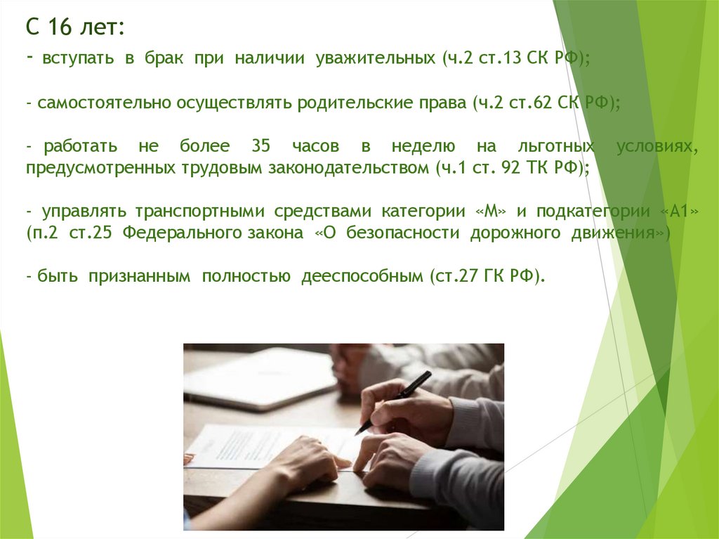 С 16 лет:- вступать в брак при наличии уважительных (ч.2 ст.13 СК РФ);