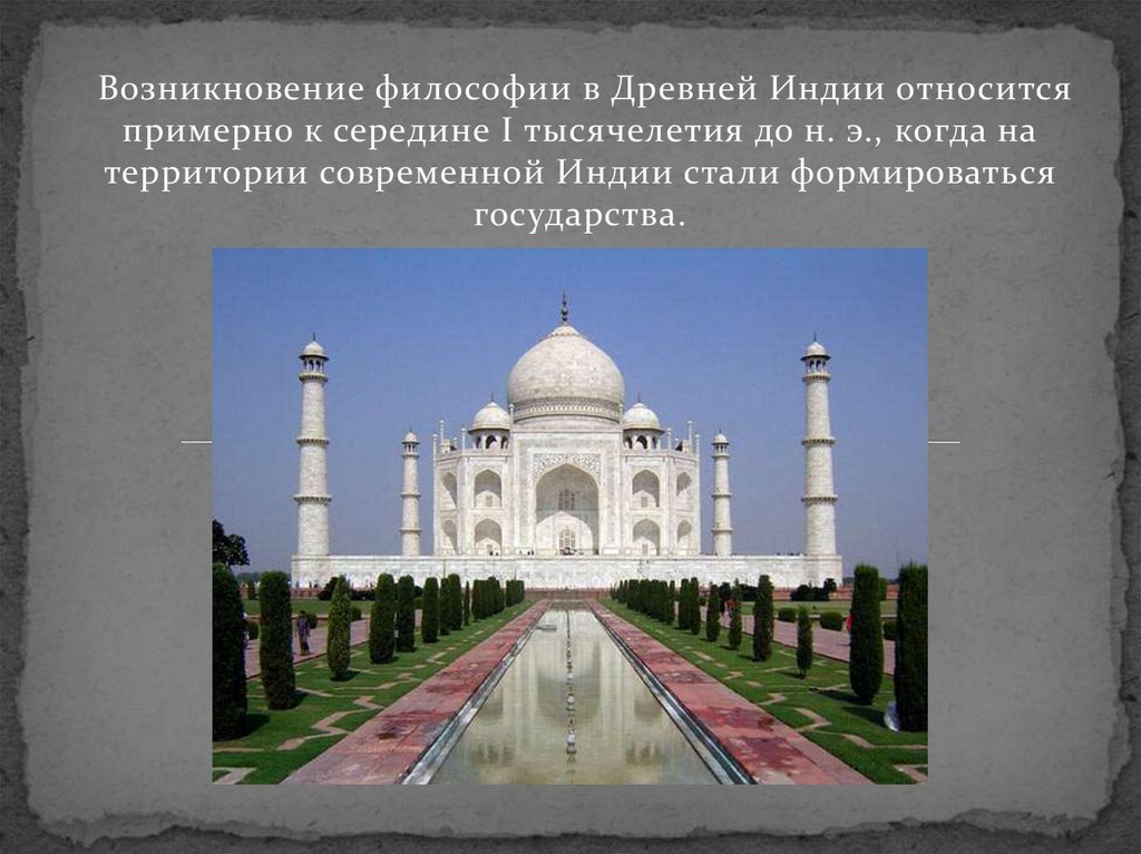 Возникновение философии в Древней Индии относитсяпримерно к середине I тысячелетия до н. э., когда на