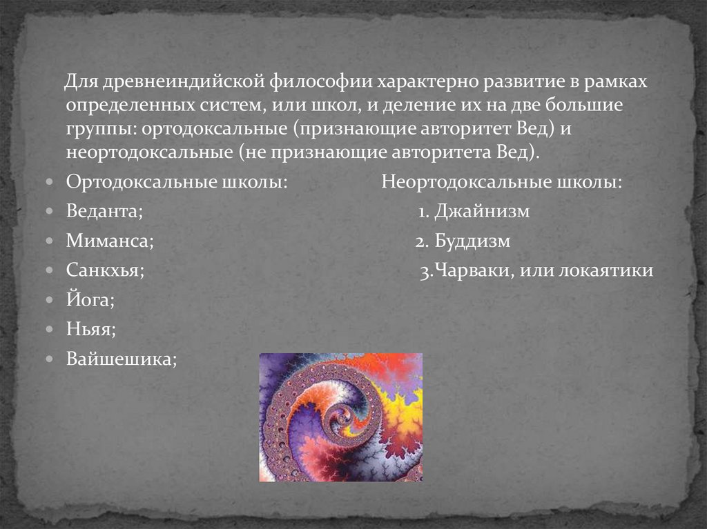 Для древнеиндийской философии характерно развитие в рамкахопределенных систем, или школ, и деление их на две большие