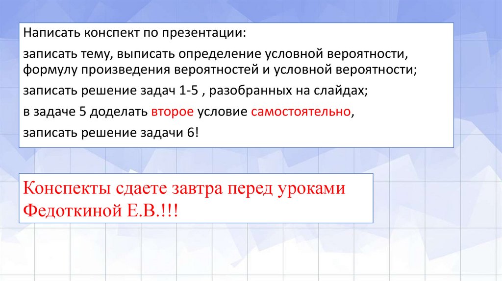 Написать конспект по презентации:записать тему, выписать определение условной вероятности,