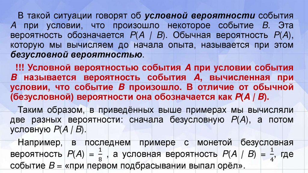 В такой ситуации говорят об условной вероятности событияA при условии, что произошло некоторое событие B. Эта