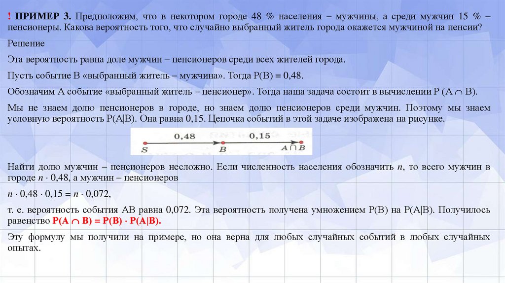 ! ПРИМЕР 3. Предположим, что в некотором городе 48 % населения – мужчины, а среди мужчин 15 % –пенсионеры. Какова вероятность того, что случайно выбранный житель города окажется мужчиной на пенсии?
