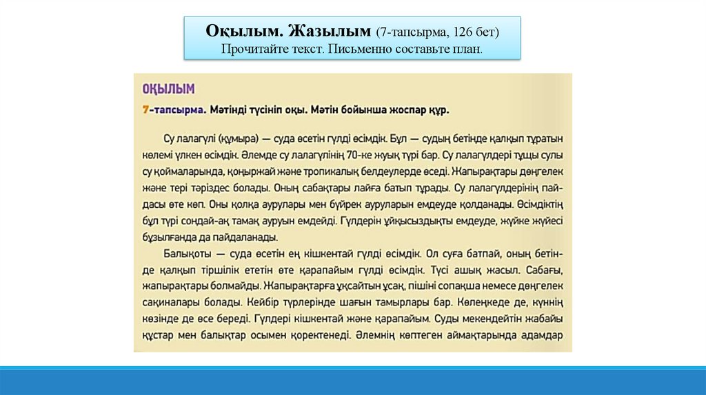 Оқылым. Жазылым (7-тапсырма, 126 бет)Прочитайте текст. Письменно составьте план.
