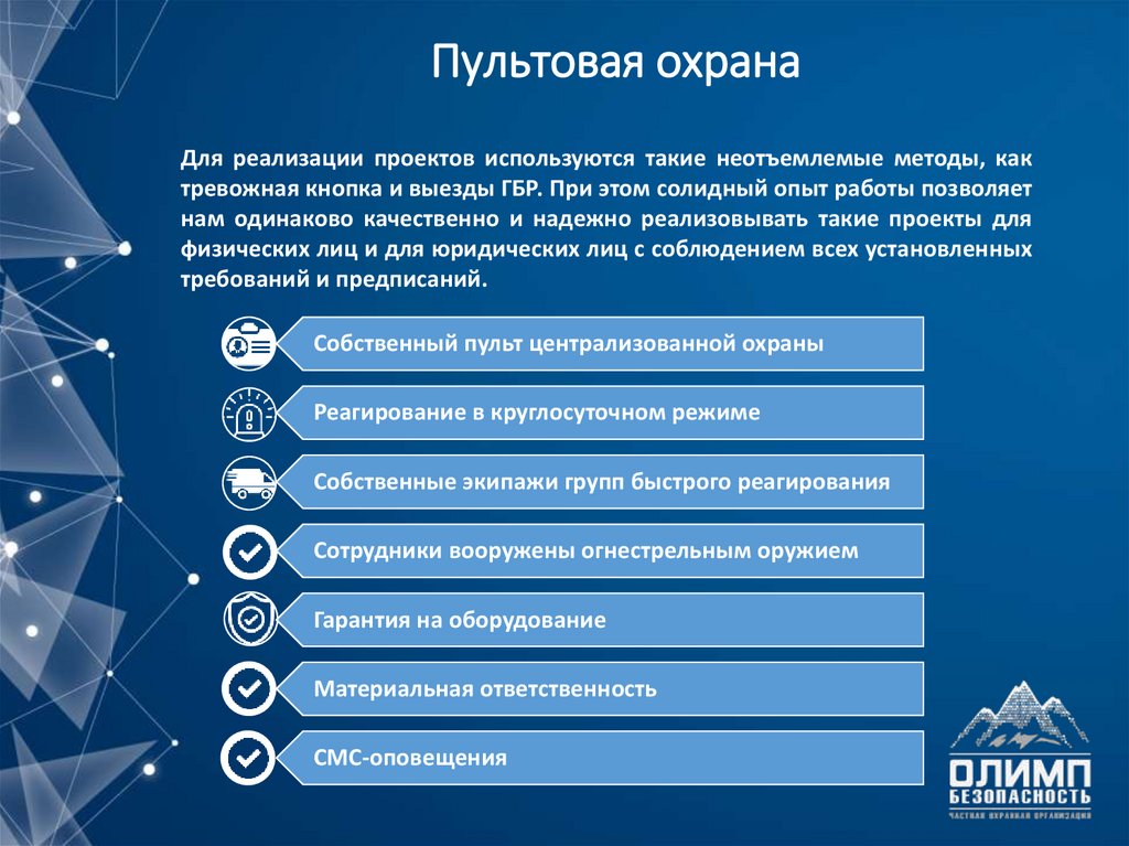 тревожная кнопка и выезды ГБР. При этом солидный опыт работы позволяет