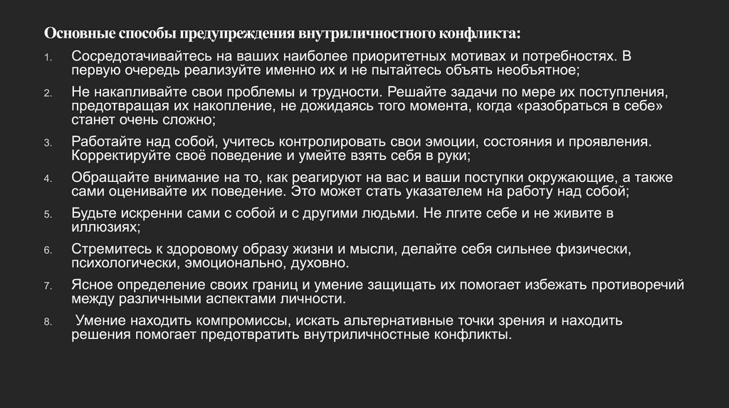 119. Назовите основные способы предупреждения внутриличностного конфликта и охарактеризуйте их