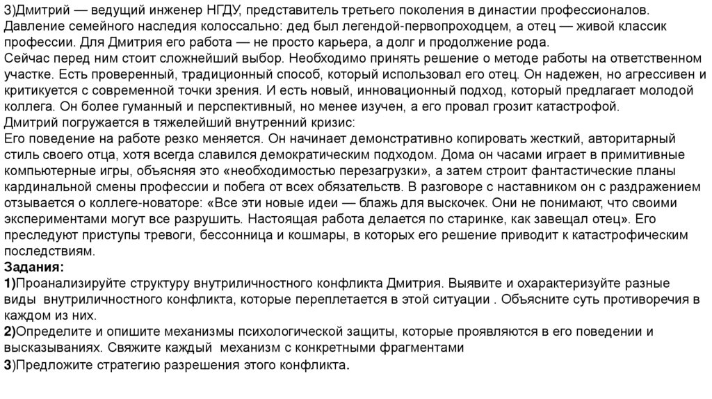 1)Проанализируйте структуру внутриличностного конфликта Дмитрия. Выявите и охарактеризуйте разные