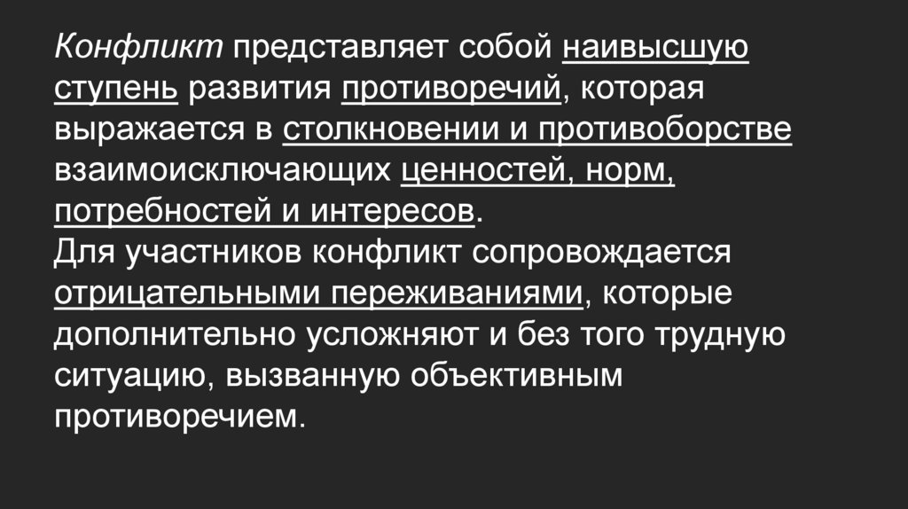 Конфликт представляет собой наивысшуюступень развития противоречий, которая