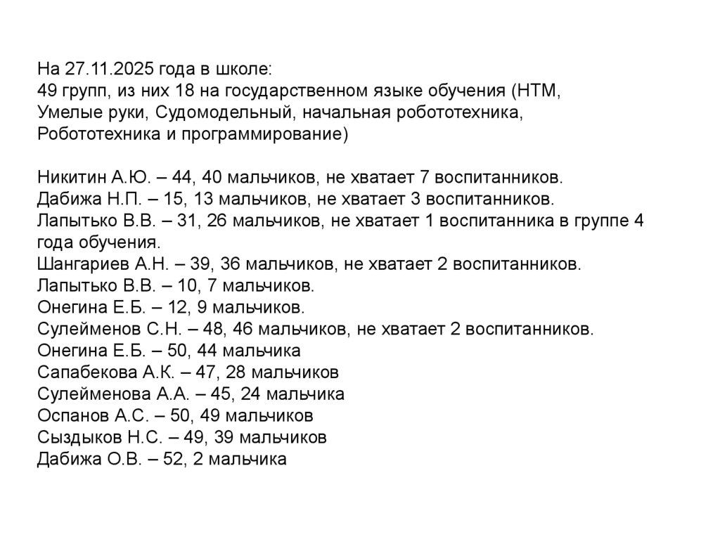 Сулейменов С.Н. – 48, 46 мальчиков, не хватает 2 воспитанников.