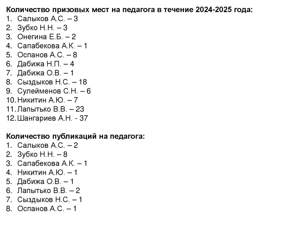 Количество призовых мест на педагога в течение 2024-2025 года:1. Салыков А.С. – 3