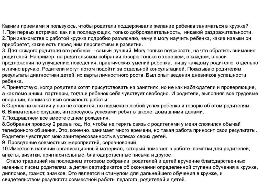 Какими приемами я пользуюсь, чтобы родители поддерживали желание ребенка заниматься в кружке?1.При первых встречах, как и в последующих, только доброжелательность, никакой раздражительности.