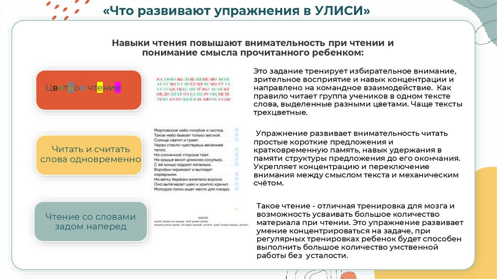 «Что развивают упражнения в УЛИСИ»Навыки чтения повышают внимательность при чтении и