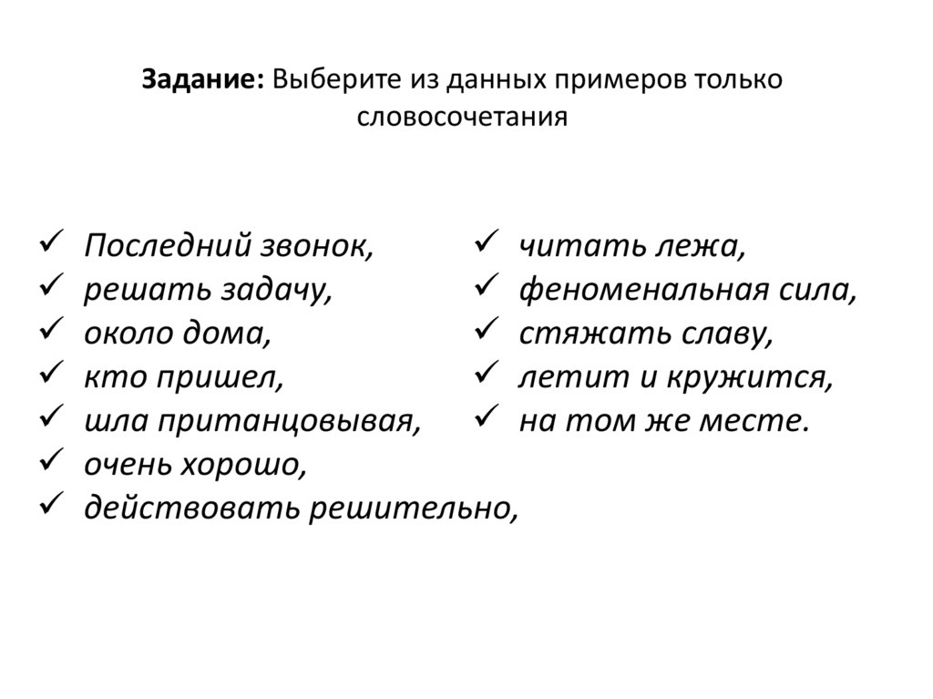 Задание: Выберите из данных примеров толькословосочетания