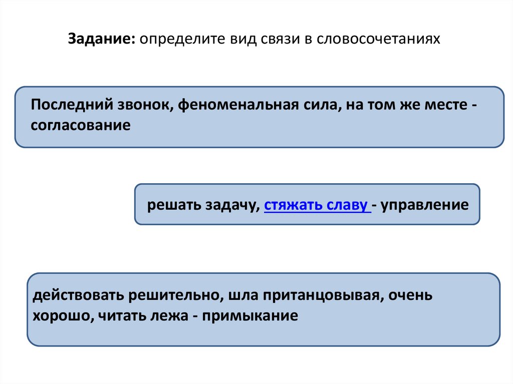 Задание: определите вид связи в словосочетанияхПоследний звонок, феноменальная сила, на том же месте согласование
