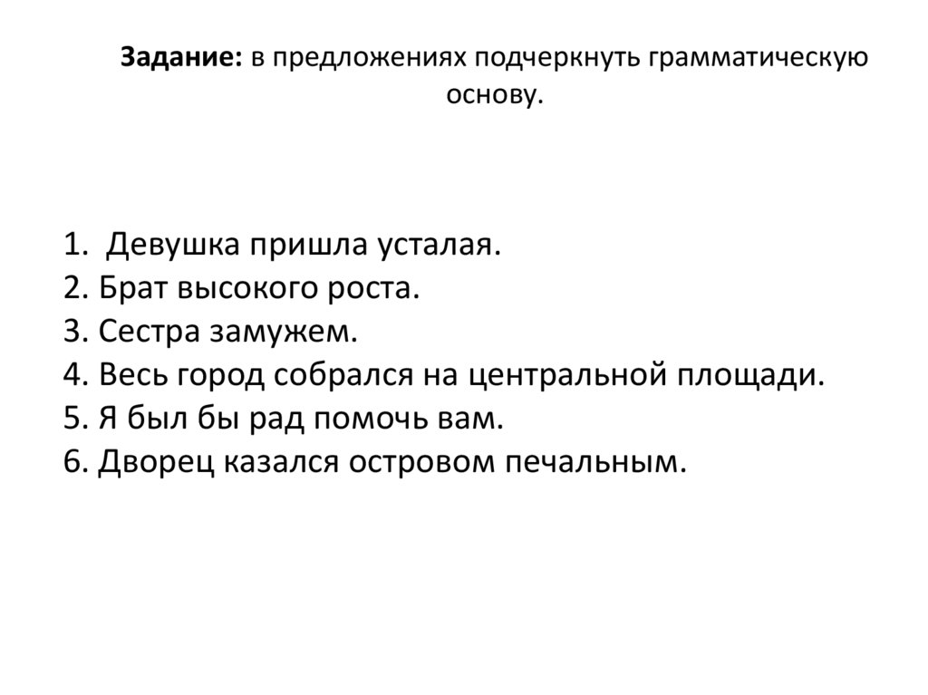 Задание: в предложениях подчеркнуть грамматическуюоснову.