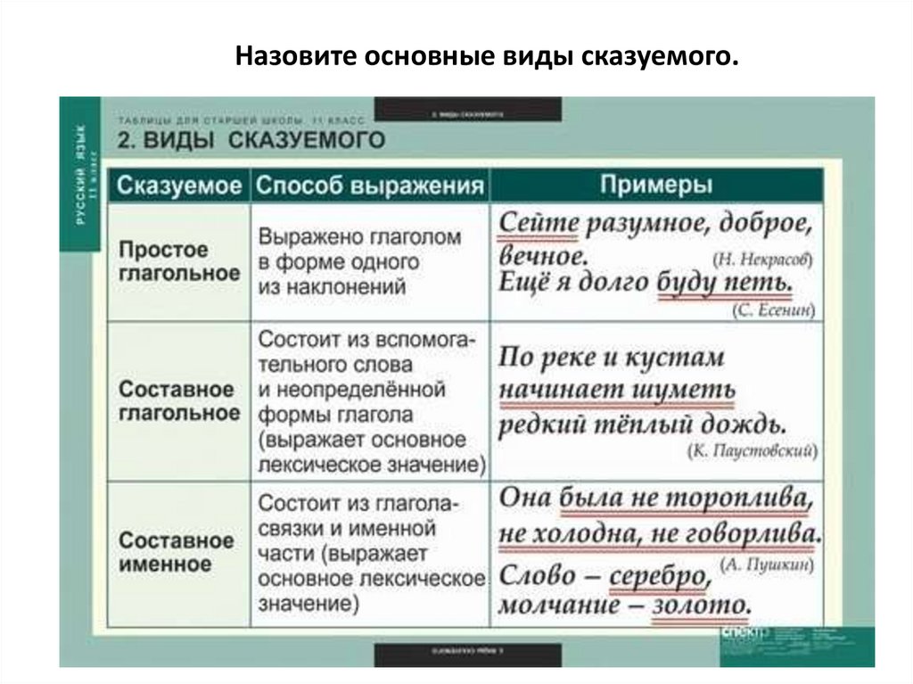Назовите основные виды сказуемого.10.