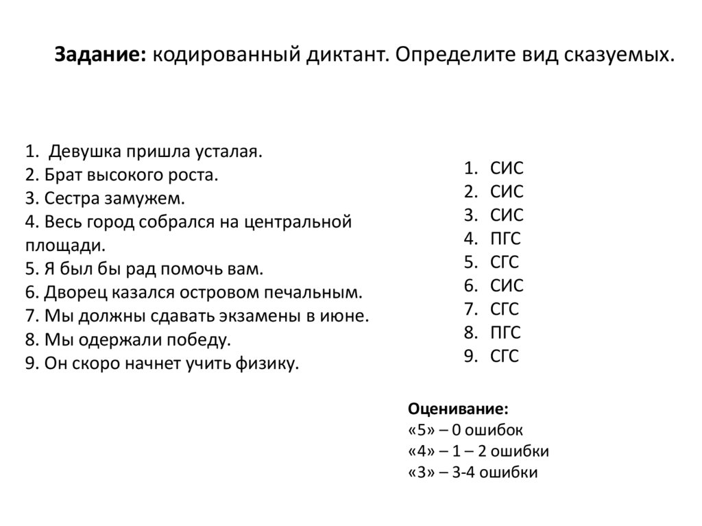 Задание: кодированный диктант. Определите вид сказуемых.1. Девушка пришла усталая.