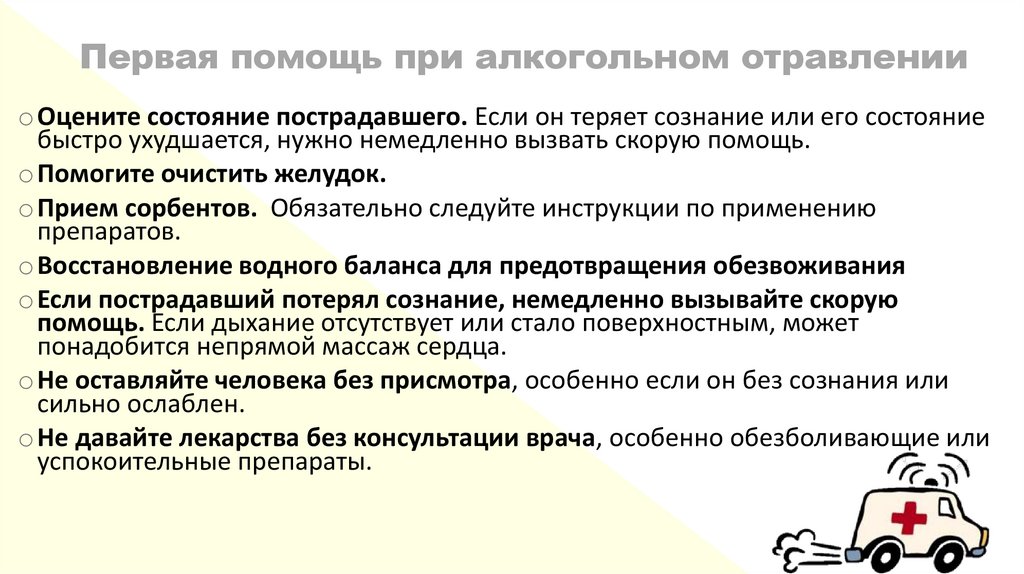 Первая помощь при алкогольном отравленииoОцените состояние пострадавшего. Если он теряет сознание или его состояние