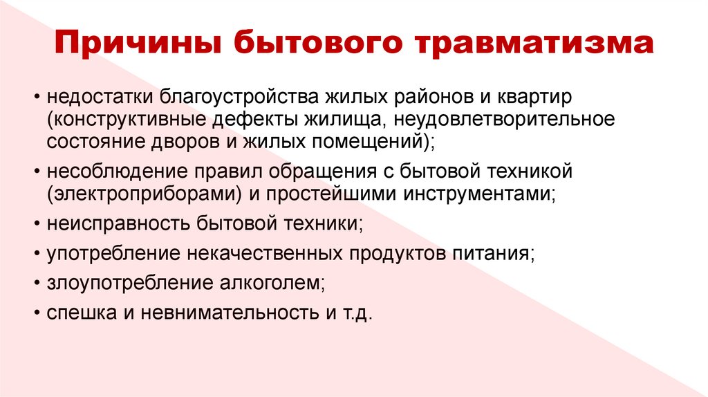 Причины бытового травматизма• недостатки благоустройства жилых районов и квартир