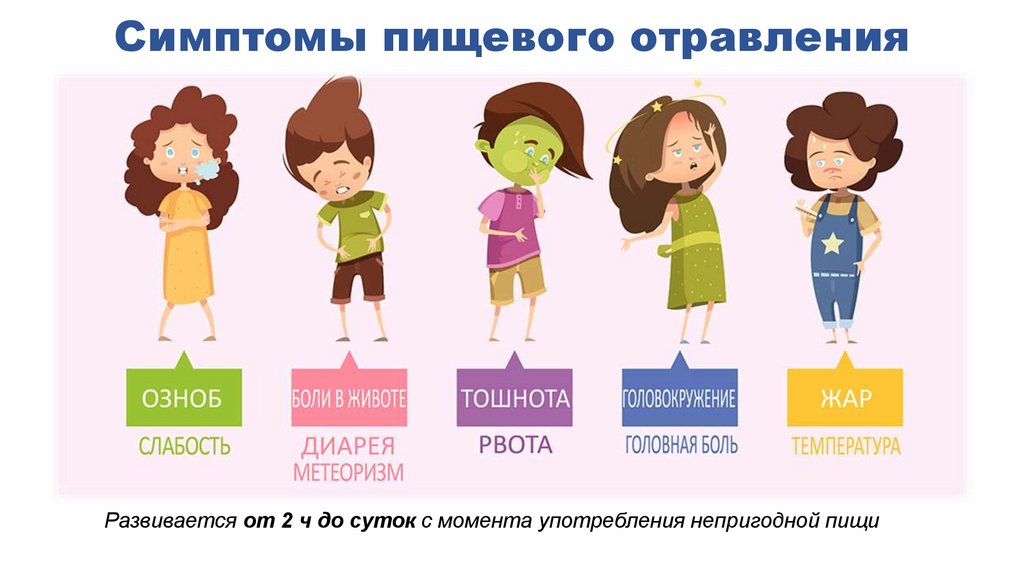 Симптомы пищевого отравленияРазвивается от 2 ч до суток с момента употребления непригодной пищи