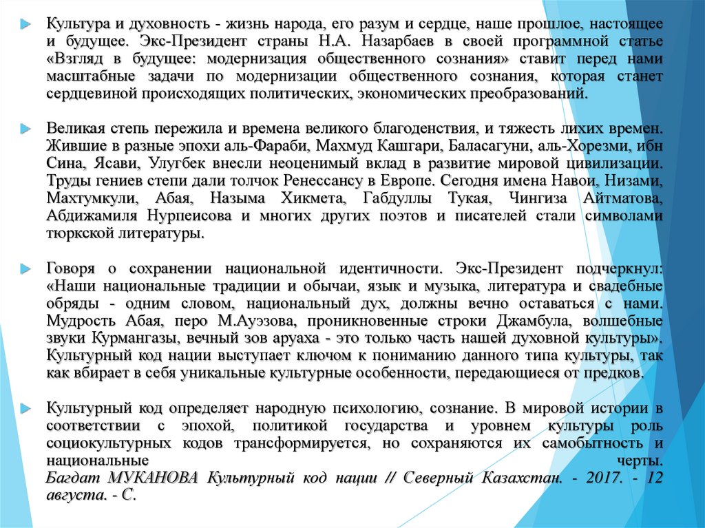 Культура и духовность - жизнь народа, его разум и сердце, наше прошлое, настоящееи будущее. Экс-Президент страны Н.А. Назарбаев в своей программной статье