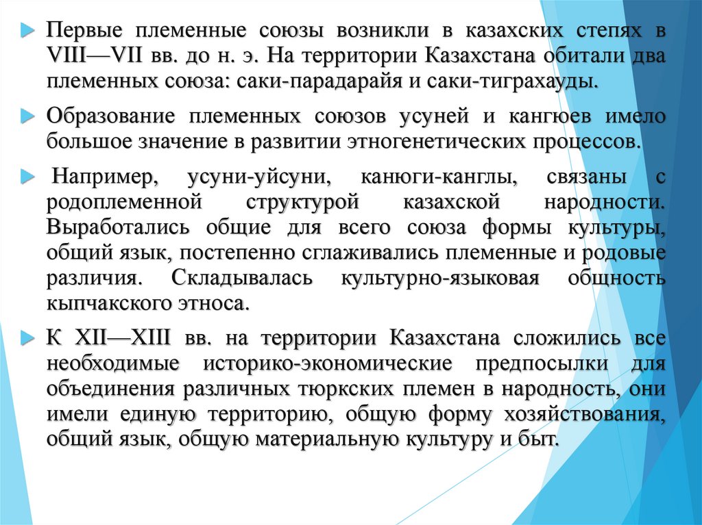 Первые племенные союзы возникли в казахских степях вVIII—VII вв. до н. э. На территории Казахстана обитали два