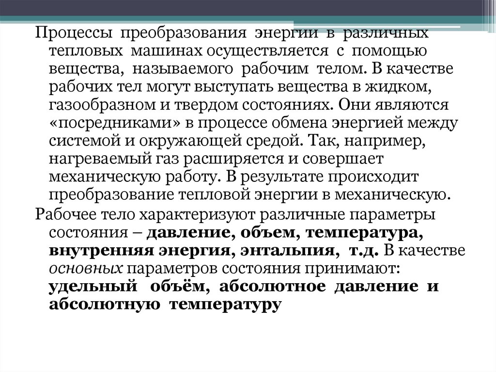 Процессы преобразования энергии в различныхтепловых машинах осуществляется с помощью