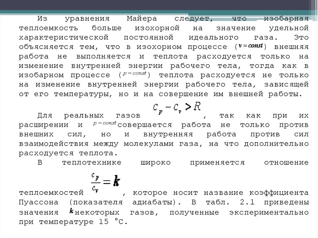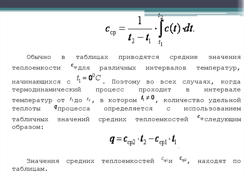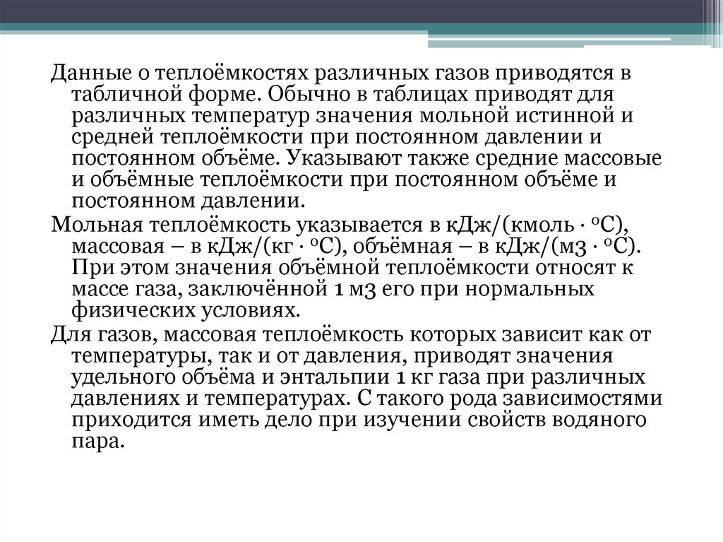 Данные о теплоёмкостях различных газов приводятся втабличной форме. Обычно в таблицах приводят для