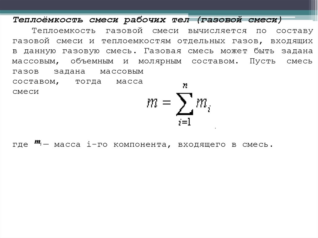 Теплоёмкость смеси рабочих тел (газовой смеси)Теплоемкость газовой смеси вычисляется по составу