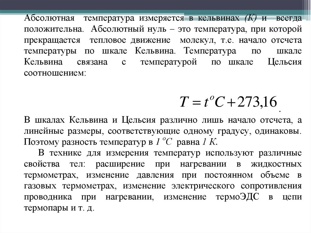 Абсолютная температура измеряется в кельвинах (К) и всегдаположительна. Абсолютный нуль – это температура, при которой