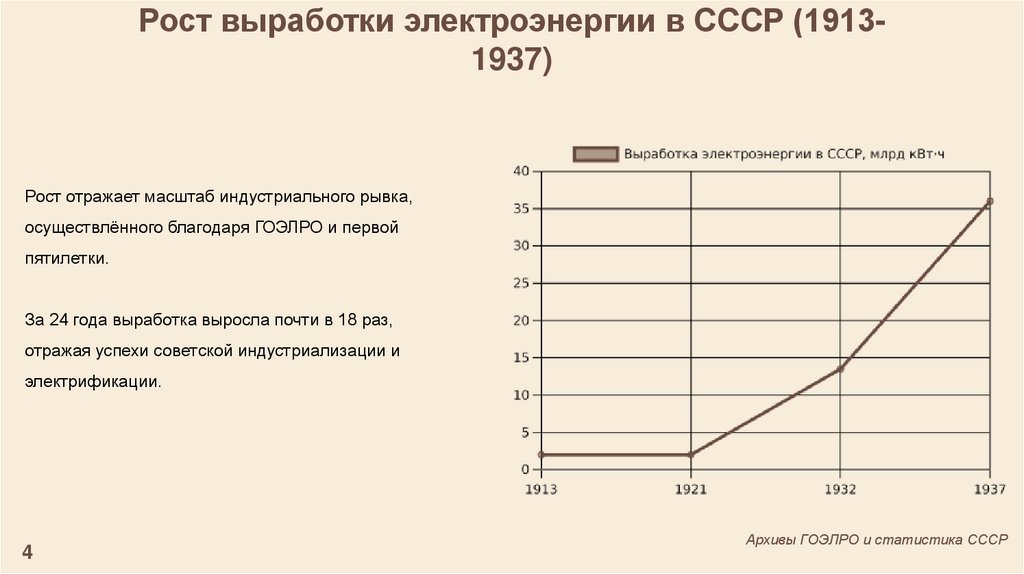 Рост выработки электроэнергии в СССР (19131937)Рост отражает масштаб индустриального рывка,