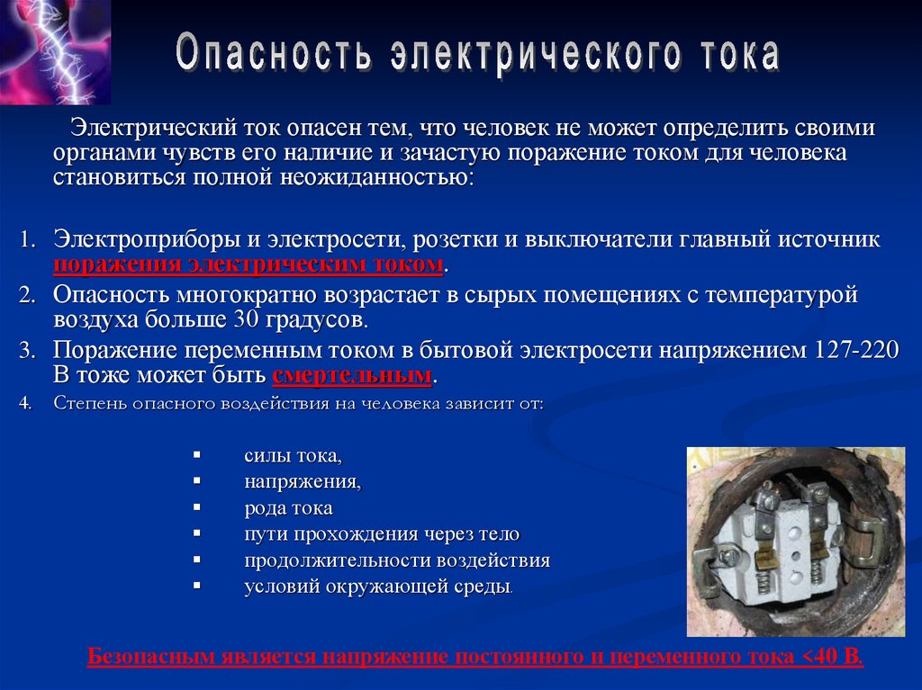 Безопасным является напряжение постоянного и переменного тока <40 В.