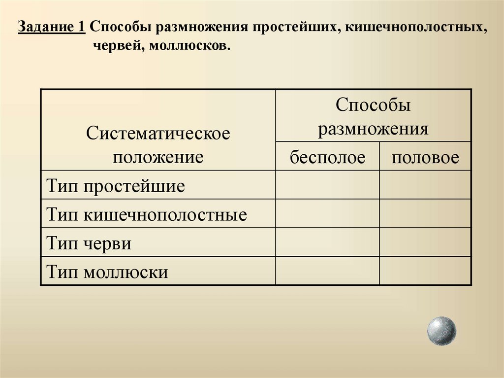 Задание 1 Способы размножения простейших, кишечнополостных,червей, моллюсков.