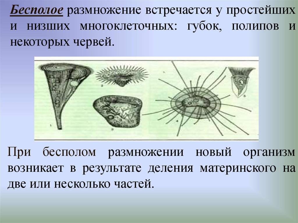 Бесполое размножение встречается у простейшихи низших многоклеточных: губок, полипов и