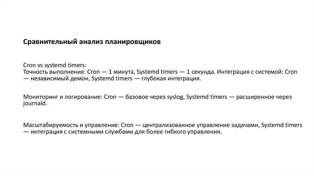 Точность выполнения: Cron — 1 минута, Systemd timers — 1 секунда. Интеграция с системой: Cron