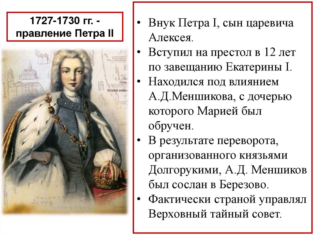 1727-1730 гг. правление Петра II• Внук Петра I, сын царевича