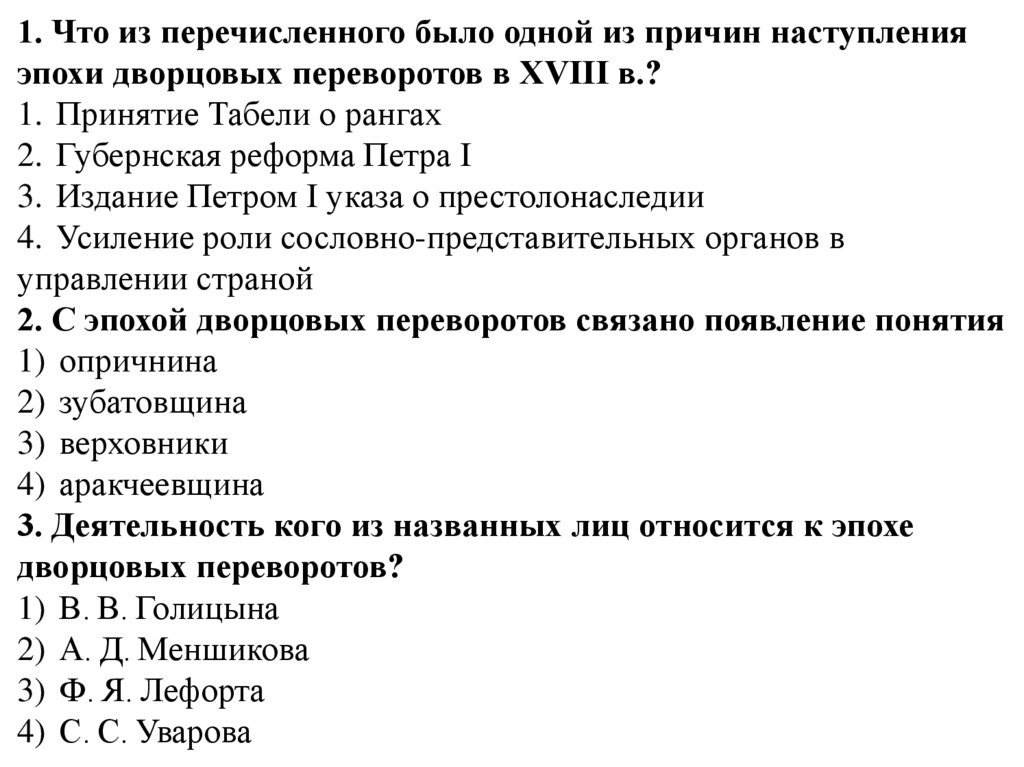 1. Что из перечисленного было одной из причин наступленияэпохи дворцовых переворотов в XVIII в.?