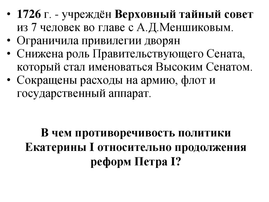 • 1726 г. - учреждён Верховный тайный советиз 7 человек во главе с А.Д.Меншиковым.