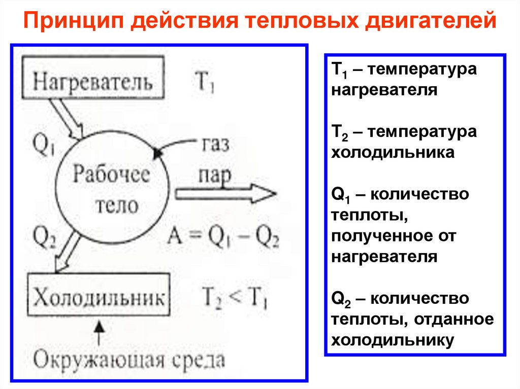 Принцип действия тепловых двигателейТ1 – температура