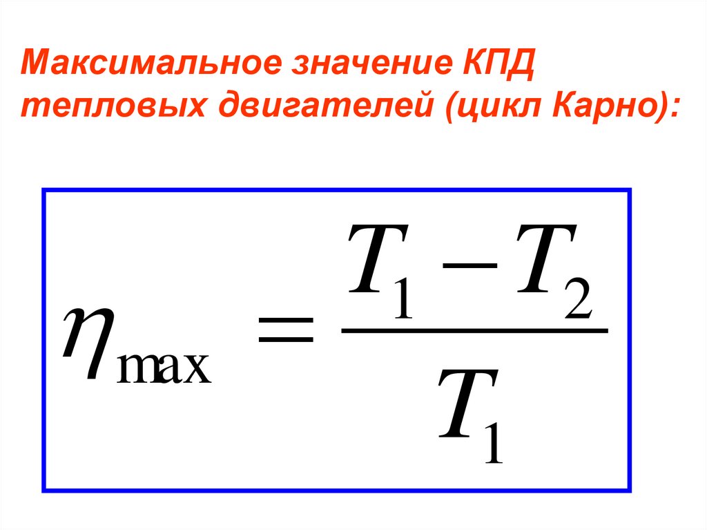 Максимальное значение КПДтепловых двигателей (цикл Карно):