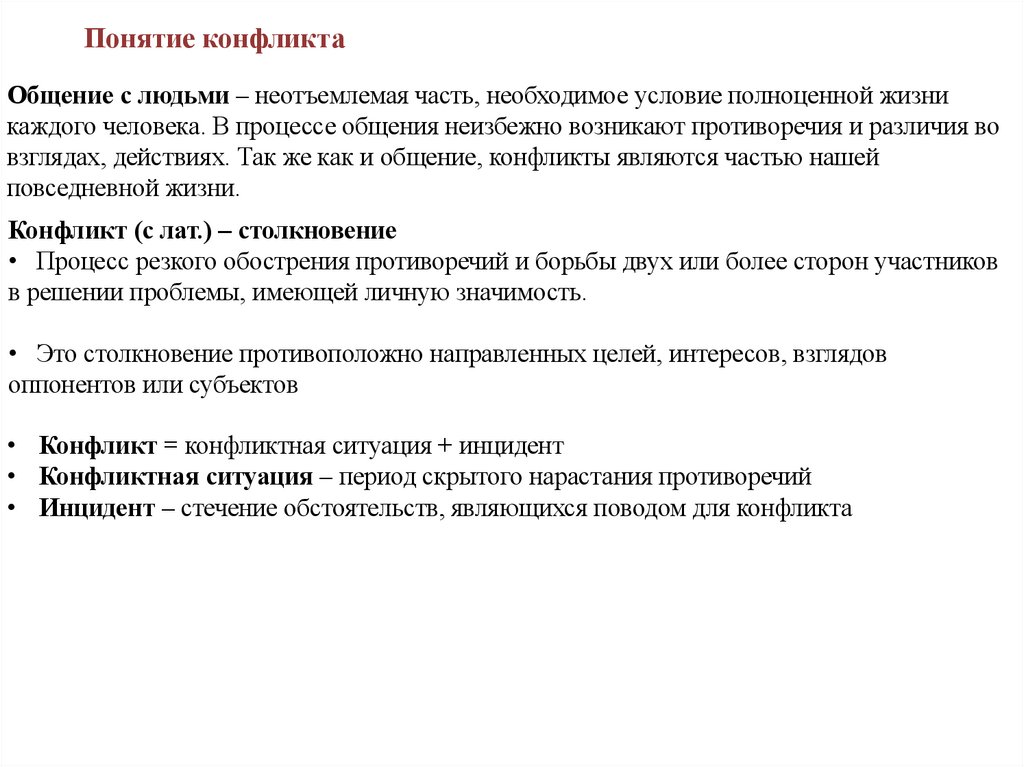 • Инцидент – стечение обстоятельств, являющихся поводом для конфликта