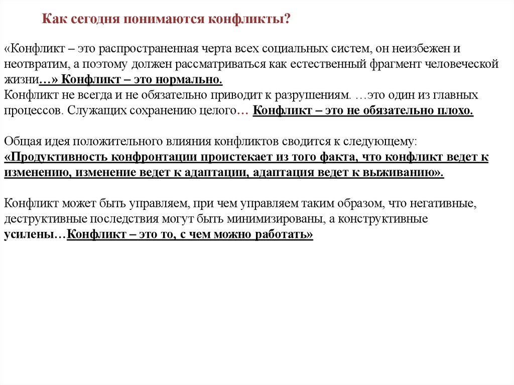 Как сегодня понимаются конфликты?«Конфликт – это распространенная черта всех социальных систем, он неизбежен и