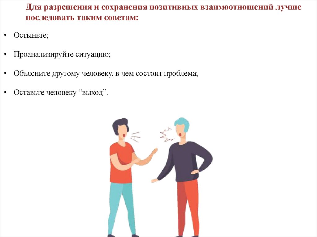 Для разрешения и сохранения позитивных взаимоотношений лучшепоследовать таким советам: