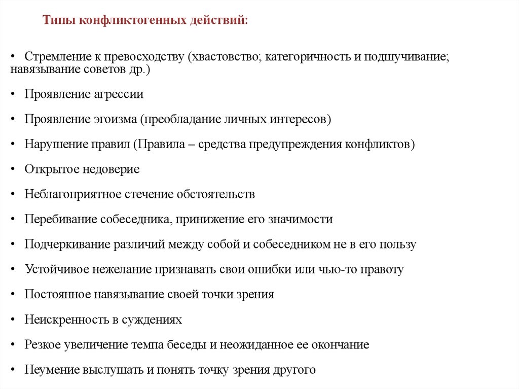 Типы конфликтогенных действий:• Стремление к превосходству (хвастовство; категоричность и подшучивание;